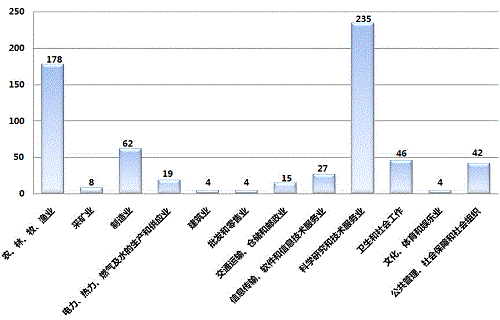 從成果應(yīng)用行業(yè)來(lái)看,農(nóng)、林、牧、漁業(yè)行業(yè)成果178項(xiàng),采礦業(yè)行業(yè)成果8項(xiàng),制造業(yè)行業(yè)成果62項(xiàng),電力、熱力、燃?xì)饧八纳a(chǎn)和供應(yīng)業(yè)行業(yè)成果19項(xiàng),建筑業(yè)行業(yè)成果4項(xiàng),批發(fā)和零售業(yè)行業(yè)成果4項(xiàng),交通運(yùn)輸、倉(cāng)儲(chǔ)和郵政業(yè)行業(yè)成果15項(xiàng),信息傳輸、軟件和信息技術(shù)服務(wù)業(yè)行業(yè)成果27項(xiàng),科學(xué)研究和技術(shù)服務(wù)業(yè)行業(yè)成果235項(xiàng),衛(wèi)生和社會(huì)工作行業(yè)成果46項(xiàng),文化、體育和娛樂業(yè)行業(yè)成果4項(xiàng),公共管理、社會(huì)保障和社會(huì)組織行業(yè)成果42項(xiàng)。