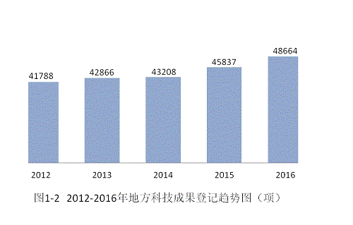 從近五年的情況來看,地方登記的科技成果總量呈現(xiàn)逐年增長的趨勢,從2012年的41788項增加到2016年的48664項,增長16.45%(見圖1-2)。