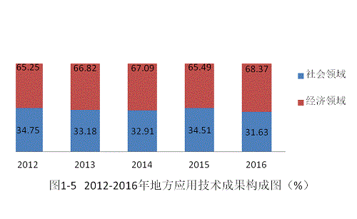 2016年地方應用技術成果在社會領域和經(jīng)濟領域的分布比例分別為31.63%、68.37%,社會領域的分布比例與上年相比略有降低。2012年以來,地方應用技術成果基本上是三分之一分布在社會領域,三分之二分布在經(jīng)濟領域(見圖1-5)。