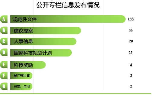 2.公開(kāi)專欄發(fā)布情況。政府信息公開(kāi)專欄完成了《科技部政府信息公開(kāi)指南》修訂并發(fā)布,《2016年科技部政府信息公開(kāi)工作年度報(bào)告》及時(shí)上網(wǎng),科技部2017年度部門預(yù)算、2016年度部門決算均上網(wǎng)公布,共主動(dòng)發(fā)布信息226條。其中,規(guī)范性文件135條,占比59.73%;人大建議和政協(xié)提案復(fù)文36條,占比15.93%;國(guó)家科技規(guī)劃計(jì)劃19條,占比8.41%。