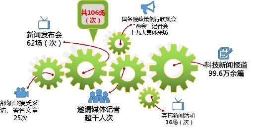 4.新聞發(fā)布會(huì)公開(kāi)情況??萍疾抗才e辦新聞發(fā)布和專題宣傳活動(dòng)106場(chǎng)(次),其中參加“兩會(huì)”記者會(huì)、十九大集體采訪、國(guó)務(wù)院政策例行吹風(fēng)會(huì)各1次,舉辦新聞發(fā)布會(huì)62場(chǎng)(次),部領(lǐng)導(dǎo)接受采訪、或刊發(fā)署名文章25次、其他新聞發(fā)布活動(dòng)16場(chǎng)(次),邀請(qǐng)媒體記者超過(guò)千人次。涉及科技部的科技新聞報(bào)道高達(dá)99.6萬(wàn)余篇(條),為社會(huì)公眾深入了解科技工作提供了便捷渠道,為科技改革與創(chuàng)新提供了有力的輿論支撐。