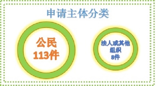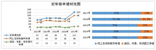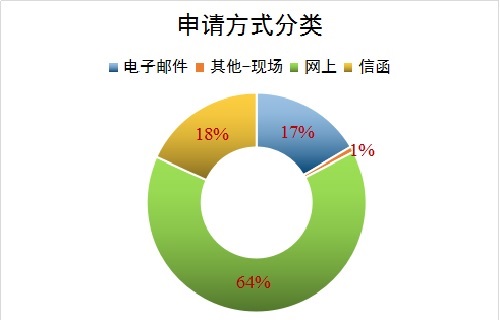 1.申請(qǐng)情況。2017年共收到依申請(qǐng)121件,超2016年50%,創(chuàng)歷年新高。按申請(qǐng)主體分類,公民依然是申請(qǐng)主力,申請(qǐng)113件,占93.39%,法人和其他組織申請(qǐng)8件,占6.61%。按申請(qǐng)方式分類,占比最大的是網(wǎng)上在線系統(tǒng),申請(qǐng)78件,占64%;信函和電子郵件占比相當(dāng),信函申請(qǐng)22件,占比18%;電子郵件申請(qǐng)20件,占比17%;另還有現(xiàn)場(chǎng)申請(qǐng)1件。按涉及業(yè)務(wù)分析,主要包括項(xiàng)目情況、政策文件、統(tǒng)計(jì)數(shù)據(jù)等,涉及科技部13個(gè)業(yè)務(wù)司局、事業(yè)單位。其中受公眾關(guān)注程度最高的三項(xiàng)分別是項(xiàng)目全過(guò)程管理相關(guān)情況、政策文件落實(shí)情況和各類經(jīng)費(fèi)數(shù)據(jù)統(tǒng)計(jì)情況。