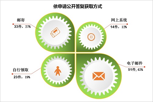 2.答復(fù)情況。121件依申請(qǐng)已全部按規(guī)定辦結(jié)。按照答復(fù)內(nèi)容分類,“已主動(dòng)公開(kāi)”的15件,占12%;“同意公開(kāi)”的60件,占50%;“同意部分公開(kāi)”的4件,占3%;“不同意公開(kāi)”的11件,占9%;“不屬于本行政機(jī)關(guān)公開(kāi)”的4件,占3%;“申請(qǐng)信息不存在”的8件,占7%;“告知作出更改補(bǔ)充”的12件,占10%;“告知通過(guò)其他途徑辦理”的7件,占6%。按答復(fù)獲取方式分類,電子郵件答復(fù)51件,郵寄答復(fù)33件,網(wǎng)上系統(tǒng)答復(fù)14件,上門自取23件。