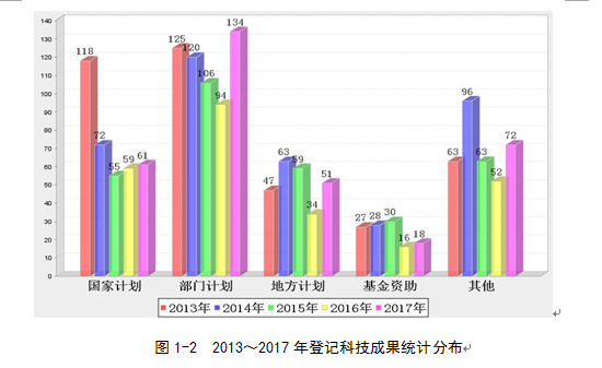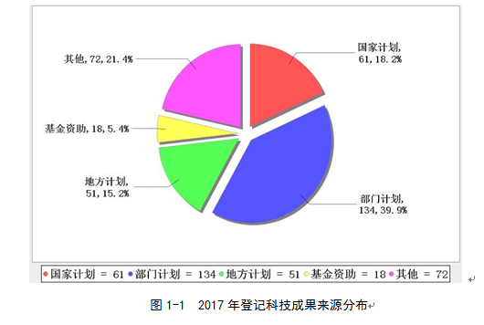 2017年登記的科技成果以部門計劃為主,共計134項,占登記總數(shù)的39.9%,比2016年增加40項。國家科技計劃61項(其中,自然科學(xué)基金12項,科技支撐計劃9項,科技基礎(chǔ)性工作專項5項,高技術(shù)研究發(fā)展計劃3項,科技重大專項2項,重點基礎(chǔ)研究發(fā)展計劃2項,國家軟科學(xué)研究計劃2項,火炬計劃1項,其他25項)占登記總數(shù)的18.2%,比2016年增加2項。地方計劃51項,占登記總數(shù)的15.2%,比2016年增加17項?;鹳Y助科技成果(除國家基金以外的部門基金、地方基金、)18項,占登記總數(shù)的5.4%,比2016年增加2項。其他科技成果(包括國際合作、橫向委托和自選等)72項,占登記總數(shù)的21.4%,比2016年增加20項。(見圖1-1、1-2)