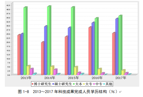 2017年,從學(xué)歷構(gòu)成看,科技成果完成人員主要集中在:本科,占比36.0%;碩士研究生,占比34.2%;博士研究生,占比25.5%。(見圖1-8)。