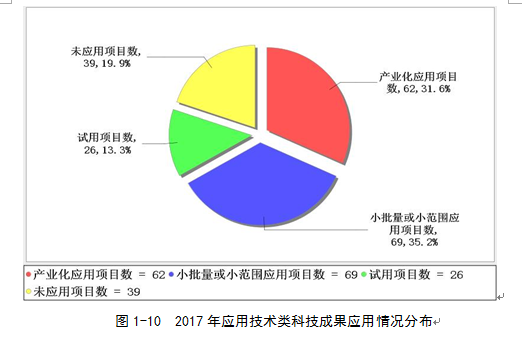 登記的應(yīng)用技術(shù)類科技成果中,小批量或小范圍應(yīng)用項目數(shù)的科技成果保持著較高的比例,為69項,占35.2%;產(chǎn)業(yè)化應(yīng)用項目數(shù)項目為62項,占31.6%;試用項目數(shù)項目為26項,占13.3%;未應(yīng)用項目數(shù)為39項,占19.9%(見圖1-10)。從總體上看,成果未應(yīng)用的主要原因是管理問題和政策因素,分別占48.7%和20.5%;其次是市場問題、資金問題和技術(shù)問題,分別占17.9%、10.3%和2.6%。