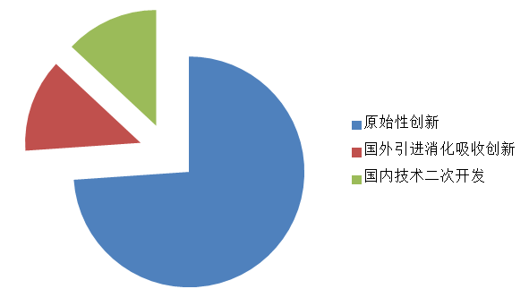 應(yīng)用技術(shù)成果類(lèi)項(xiàng)目中原始性創(chuàng)新項(xiàng)目為34項(xiàng),國(guó)外引進(jìn)消化吸收創(chuàng)新為6項(xiàng),國(guó)內(nèi)技術(shù)二次開(kāi)發(fā)為6項(xiàng),分別占項(xiàng)目總數(shù)的73.91%、13.04%和13.04%。具體情況見(jiàn)圖8。