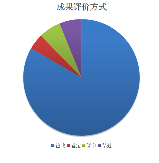 現(xiàn)階段,我部科技成果評(píng)價(jià)方式大部分是驗(yàn)收。2018年登記項(xiàng)目中科技成果驗(yàn)收項(xiàng)目數(shù)為95項(xiàng),鑒定、評(píng)審和結(jié)題項(xiàng)目數(shù)分別是5項(xiàng)、7項(xiàng)和7項(xiàng),分別占項(xiàng)目總數(shù)的83.33%、4.39%、6.14%和6.14%。成果評(píng)價(jià)方式見(jiàn)圖2。