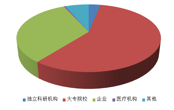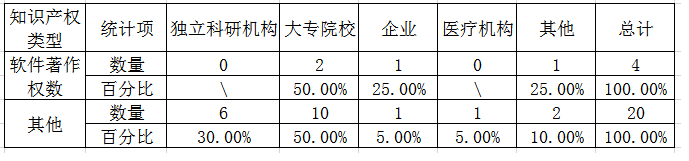 2018年,登記項(xiàng)目中擁有知識(shí)產(chǎn)權(quán)項(xiàng)目為24項(xiàng)。其中,軟件著作權(quán)數(shù)為4項(xiàng),占項(xiàng)目總數(shù)的16.67%;其他為20項(xiàng),占項(xiàng)目總數(shù)的83.33%。已授權(quán)專(zhuān)利數(shù)為15項(xiàng)。從獲得知識(shí)產(chǎn)權(quán)項(xiàng)目的承擔(dān)單位性質(zhì)來(lái)看,大多數(shù)為獨(dú)立科研機(jī)構(gòu)和大專(zhuān)院校,分別為6個(gè)和12個(gè),占總數(shù)的25%和50%;企業(yè)為2個(gè)、醫(yī)療機(jī)構(gòu)為1個(gè)、其他為3個(gè)。知識(shí)產(chǎn)權(quán)項(xiàng)目分布見(jiàn)圖3。