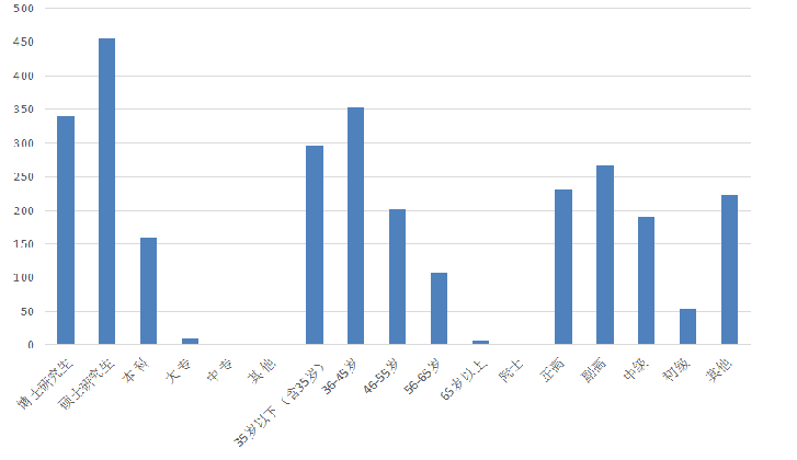 2018年,登記項(xiàng)目中涉及到的完成人員共966人。其中,文化程度方面,博士研究生為339人,碩士研究生為455人,本科為160人,大專(zhuān)為10人,其他為2人,分別占人員總數(shù)的35.09%、47.10%、16.56%、1.04%、0.21%;年齡結(jié)構(gòu)方面,呈現(xiàn)老中青合理分布的狀態(tài),35歲以下為296人,36-45歲為354人,46-55歲為201人,56-65歲為108人,65歲以上為7人,分別占人員總數(shù)的30.64%、36.65%、20.81%、11.18%、0.72%;技術(shù)職稱(chēng)方面,有院士職稱(chēng)的為1人,正高職稱(chēng)的為231人,副高職稱(chēng)的為267人,中級(jí)職稱(chēng)的為191人,初級(jí)職稱(chēng)的為53人,其他為223人,分別占人員總數(shù)的0.1%、23.91%、27.64%、19.77%、5.49%、23.08%。具體情況見(jiàn)圖6。