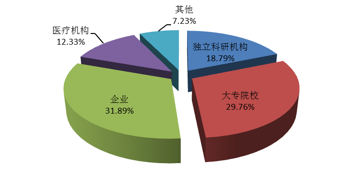 2018年,企業(yè)成為了全省科技成果主要完成單位,所占份額高于大專院校。2018年,按成果登記量排序依次是:企業(yè)375項,占31.9%,較上年提升4.7個百分點;大專院校350項,占29.8%,較上年下降13.1個百分點;科研機構(gòu)221項,占18.8%,較上年提升2.3個百分點;醫(yī)療機構(gòu)145項,占12.3%,較上年提升4.0個百分點;其他85項,占7.2%,較上年提升2.1個百分點。