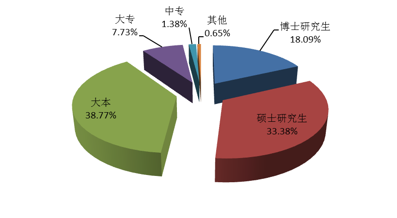 從完成人員文化程度分布來看,本科學歷3848人次,占總?cè)藬?shù)的38.8%;碩士研究生3313人次,占33.4%;博士研究生1796人次,占18.1%;大專767人次,占7.7%;中專及其他共計202人次,占2.0%。