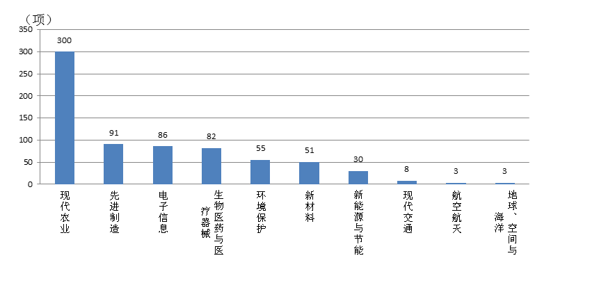 統(tǒng)計數(shù)據(jù)顯示,在844項應(yīng)用技術(shù)成果中,有709項屬于高新技術(shù)領(lǐng)域,占到應(yīng)用技術(shù)成果八成以上。我省科技成果共涉及10大類高新技術(shù)領(lǐng)域,其中現(xiàn)代農(nóng)業(yè)、先進制造、電子信息、生物醫(yī)藥與醫(yī)療器械及環(huán)境保護五大領(lǐng)域的成果占到了全部高新技術(shù)領(lǐng)域的八成以上,特別是現(xiàn)代農(nóng)業(yè)領(lǐng)域達300項,占42.3%。