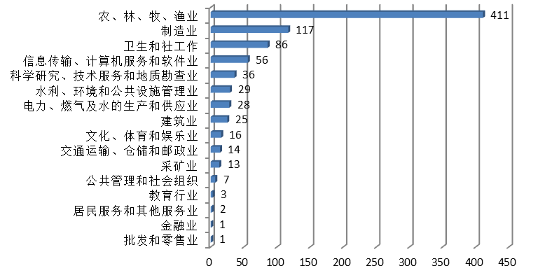 從成果應(yīng)用的國民經(jīng)濟行業(yè)來看,在844項應(yīng)用技術(shù)成果,廣泛應(yīng)用在15個行業(yè)中,其中,農(nóng)林牧漁業(yè)、制造業(yè)及衛(wèi)生和社會工作三個行業(yè)中科技成果應(yīng)用的最多,科技成果數(shù)量依次為411項、117項和86項,這三個行業(yè)的科技成果占應(yīng)用技術(shù)成果總量的72.7%。