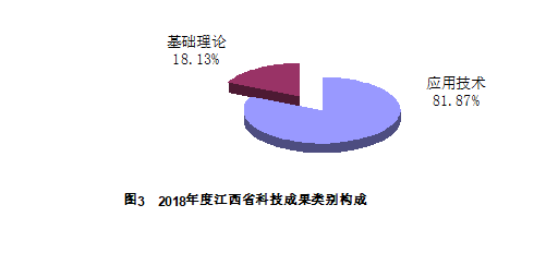 2018年度全省登記的科技成果仍以應(yīng)用技術(shù)成果為主,為569項,與上年相比下降了1.39%,占全年登記成果總數(shù)的81.87%;基礎(chǔ)理論成果126項,占成果總數(shù)的18.13%,與上年相比上升了113.56%;軟科學(xué)成果0項(見圖3)。