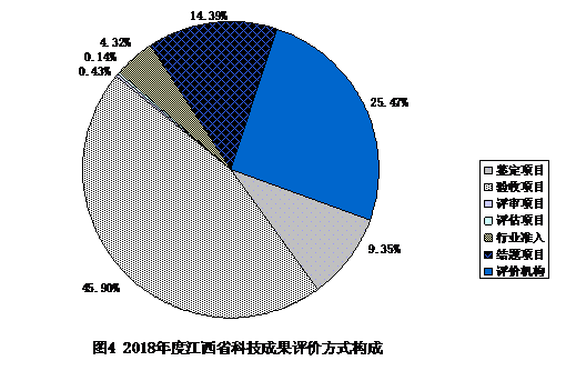 2018年度江西省登記的成果評價方式以驗收為主,機(jī)構(gòu)評價、結(jié)題為輔,鑒定及其他評價方式并存。登記成果中驗收項目319項,占登記成果總數(shù)的45.90%,比上年上升10.63個百分點;機(jī)構(gòu)評價項目177項,占25.47%,結(jié)題項目100項,占14.39%;鑒定、評審、評估、行業(yè)準(zhǔn)入等其他評價方式項目99項,占14.24%(見圖4)。
