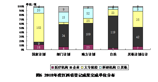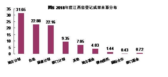 2018年度全省登記的科技成果仍以地方財政支持的各類計劃項目為主,自選和國家科技計劃項目成果占比重也較大(見圖5)。其中,國家科技計劃項目成果154項(科技重大專項3項,自然科學(xué)基金104項,重點基礎(chǔ)研究發(fā)展計劃3項,國家科技支撐計劃22項,高技術(shù)研究發(fā)展計劃4項,國家軟科學(xué)研究計劃3項,國家重點新產(chǎn)品計劃、國際科技合作專項、科技基礎(chǔ)性工作專項各2項,農(nóng)業(yè)科技成果轉(zhuǎn)化資金及科技富民強(qiáng)縣專項各1項、其它7項),占登記總量的22.16%;部門計劃65項,占9.35%;地方計劃220項,占31.65%;自選159項,占22.88%。地方計劃、自選項目和國家計劃項目是成果的主要來源。