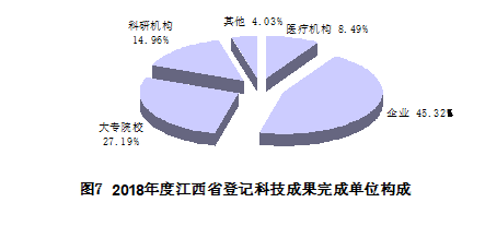 2018年度全省登記的科技成果中,按第一完成單位屬性分,企業(yè)登記數(shù)所占比例最大,共315項,占45.32%;其次是大專院校189項,占27.19%,獨立科研機(jī)構(gòu)104項,占14.96%,醫(yī)療機(jī)構(gòu)59項,占8.49%,其他單位28項,占4.03%。數(shù)據(jù)顯示,2018年我省科技成果主要分布在企業(yè)、大專院校,在成果第一完成單位中所占比例為本年度登記成果完成單位的72.51%,凸顯了企業(yè)與大專院校在我省科技創(chuàng)新中的主體地位(見圖7)。