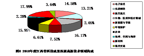 2018年度江西省登記的569項應(yīng)用技術(shù)成果中,有439項屬高新技術(shù)領(lǐng)域,占登記的科技成果總數(shù)的63.17%。其中,電子信息64項,占所登記的高新技術(shù)領(lǐng)域成果總量的14.58%;先進(jìn)制造58項,占13.21%;航空航天9項,占2.05%;現(xiàn)代交通16項,占3.64%;生物醫(yī)藥和醫(yī)療器械71項,占16.17%;新材料79項,占17.99%;新能源與節(jié)能33項,占7.52%;環(huán)境保護(hù)29項,占6.61%;地球、空間與海洋10項,占2.28%;現(xiàn)代農(nóng)業(yè)70項,占15.95%。生物醫(yī)藥領(lǐng)域在全省高新技術(shù)領(lǐng)域中所占比例最高,其次新材料和農(nóng)業(yè)也都占有較大比例( 見圖8)。