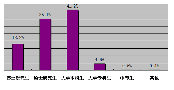 成果完成人情況中,按文化程度區(qū)分:博士研究生1191名,占完成人總?cè)藬?shù)的18.2%;碩士研究生2292名,占完成人總?cè)藬?shù)的35.1%;大學(xué)本科生2688名,占完成人總?cè)藬?shù)的41.2%;大學(xué)??粕?span lang="EN-US">300名,占完成人總?cè)藬?shù)的4.6%;中專生33名,占完成人總?cè)藬?shù)的0.5%;其他學(xué)歷24名,占完成人總?cè)藬?shù)的0.4%(見圖表7)。統(tǒng)計數(shù)據(jù)顯示,我區(qū)的科技工作者隊伍以大學(xué)本科及以上學(xué)歷為主。