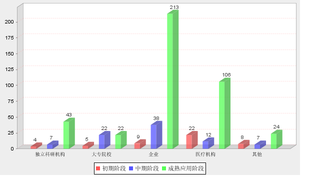 2018年應(yīng)用技術(shù)成果中所處階段,初級階段有48項,占比9%;中期階段有86項,占比16%;成熟應(yīng)用階段406項,占比75%。在成熟應(yīng)用階段成果中企業(yè)完成的達(dá)到213項,占本階段所有成果數(shù)的52%。表明企業(yè)的科技成果研發(fā)針對性較強(qiáng),成果應(yīng)用較好。(見圖表12)