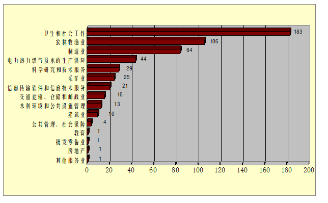 林、牧、漁業(yè)項目106項,占應(yīng)用技術(shù)成果總數(shù)的19.6%;第三是制造業(yè)84項,占應(yīng)用技術(shù)成果總數(shù)的15.6%;其他依次為電力熱力燃?xì)饧八纳a(chǎn)供應(yīng)44項,占比8.1%;科學(xué)研究和技術(shù)服務(wù)29項,占比5.4%;采礦業(yè)25項,占比4.6%;信息傳輸、軟件和信息技術(shù)服務(wù)業(yè)21項,占比3.9%;交通運輸、倉儲和郵政業(yè)16項,占比3%;水利環(huán)境和公共設(shè)施管理業(yè)13項。占比2.4%;建筑業(yè)10項,占比1.9%;公共管理、社會保障和社會組織4項,占比0.7%;教育行業(yè)1項,批發(fā)和零售業(yè)1項,房地產(chǎn)業(yè)1項,其他服務(wù)業(yè)1項,各占比0.2%。