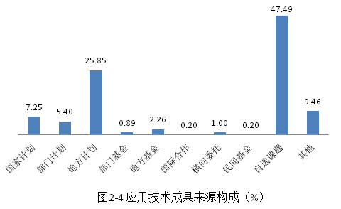 應(yīng)用技術(shù)成果主要來自自選課題和地方計(jì)劃,二者的占比分別為:47.49%和25.85%;國(guó)家計(jì)劃所占比例為7.25%(見圖2-4)。