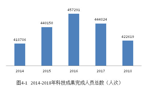 2018年登記的科技成果涉及到的完成人員共422619人次,比上年下降4.99%。