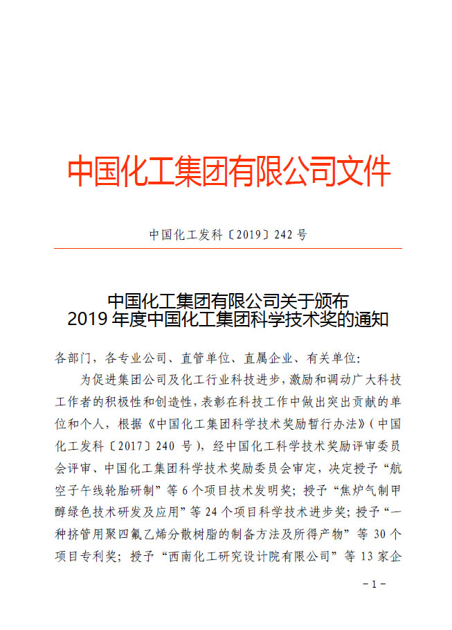 文件下載:中國化工集團(tuán)有限公司關(guān)于頒布2019年度中國化工集團(tuán)科學(xué)技術(shù)獎的通知.rar.rar