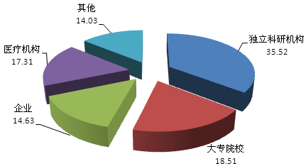 獨立科研院所和大專院校是項目成果的主要完成單位,按成果數(shù)量排序依次是:獨立科研機構119項,占35.52%;大專院校62項,占18.51%;醫(yī)療機構58項,占17.31%;企業(yè)49項,占14.63%;其他項目47項,占14.03%(見圖3)。