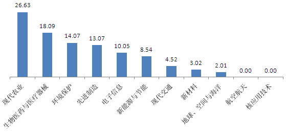 199項應用技術成果屬于高新技術領域,主要分布在現(xiàn)代農(nóng)業(yè)、生物醫(yī)藥與醫(yī)療器械領域,其次是環(huán)境保護、先進制造、電子信息、新能源與節(jié)能等領域,現(xiàn)代交通、新材料和地球、空間與海洋等領域項目成果也占一定比例(見圖6)。