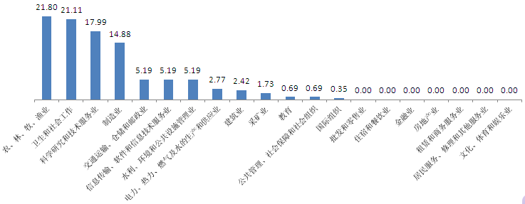 應用技術成果主要應用于農(nóng)、林、牧、漁業(yè)與衛(wèi)生和社會工作行業(yè),分別占21.80%和21.11%;科學研究和技術服務業(yè)與制造業(yè)等應用成果也占較大比例,共32.87%(見圖7)。