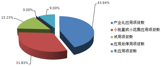目前,已應用的技術成果有219項,占應用技術成果的75.77%;試用項目數(shù)44項,占應用技術成果的15.23%;未應用項目數(shù)26項,占應用技術成果的9.00%(見圖8)。