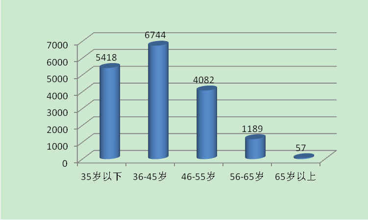 項目完成人中35歲以下人員5418人,占30.98%;36-45歲人員6744人,占38.56%;46-55歲人員4082人,占23.29%;56-65歲人員1189人,占6.80%;65歲以上人員57人,占0.33%。