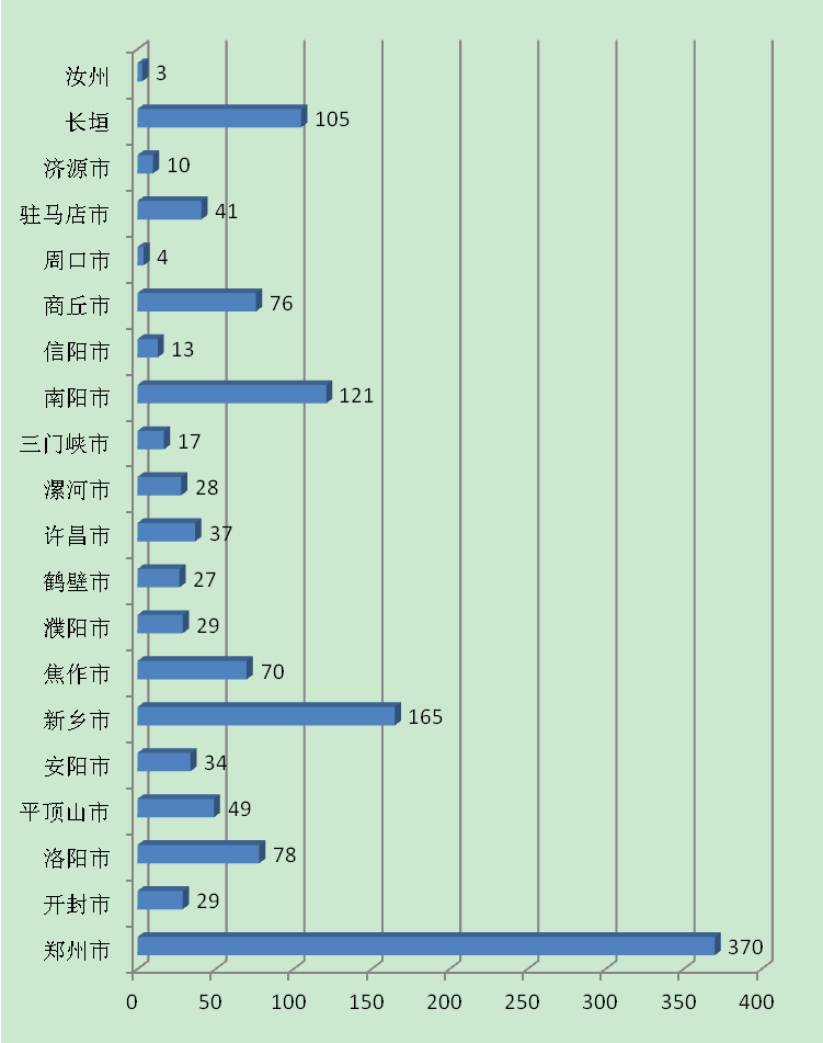 2019年省轄市推薦登記的1198項成果中,鄭州市370項,占18.92%;新鄉(xiāng)市165項,占8.44%;洛陽市78項,占3.99%;安陽市34項,占1.74%;濮陽市29項,占1.48%;開封市29項,占1.48%;南陽市121項,占6.19%;焦作市70項,占3.58%;駐馬店市41項,占2.10%;信陽市13項,占0.66%;平頂山市49項,占2.51%;許昌市37項,占1.89%;商丘市76項,占3.89%;鶴壁市27項,占1.38%;濟源市10項,占0.51%;漯河市28項,占1.43%;三門峽市17項,占0.87%;周口市4項,占0.20%;長垣縣105項,占5.37%;汝州市3項,占0.15%;鞏義市9項,占0.46%。