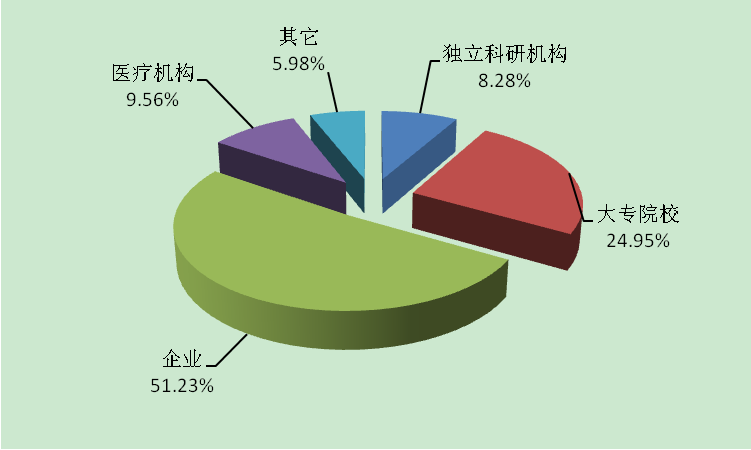2019年度河南省登記的1956項成果中,獨立科研機構(gòu)完成的162項,占8.28%;大專院校完成的488項,占24.95%;企業(yè)完成的1002項,占51.23%;醫(yī)療機構(gòu)完成的187項,占9.56%;其他性質(zhì)單位完成的117項,占5.98%。