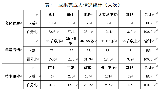 從年齡結(jié)構(gòu)來看,今年成果完成人員分布較均衡,主要集中在45歲以下(含45歲)這個年齡段人數(shù)居多,為228人,占人員總數(shù)的47%;其次是46-55歲,分別為152人,占人員總數(shù)的31.2%;56-65歲和65歲以上兩個年齡段人員較少,共106人,僅占人員總數(shù)的21.8%。