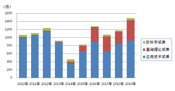 2019年應用技術(shù)成果922項,占62.3%,較上年增長9.2%;基礎(chǔ)理論研究成果504項,占34.1%,較上年增長69.7%;軟科學成果53項,占3.6%,較上年增長51.4%。