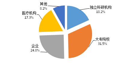 2019年,從完成單位的屬性劃分來看,大專院校466項,占31.5%,較上年提升1.7個百分點;企業(yè)367項,占24.8%,較上年下降7.1個百分點;科研機構(gòu)269項,占18.2%,較上年下降0.6個百分點;醫(yī)療機構(gòu)256項,占17.3%,較上年提升5.0個百分點;其他121項,占8.2%,較上年提升1個百分點。