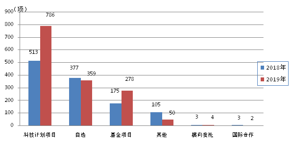 2019年,全省登記的科技成果以各類科技計劃項目為主,政府資金起主導作用,其中來源于各類科技計劃項目的成果786項,較上年增長53.2%,占登記成果總數(shù)的53.1%;自選項目359項,較上年減少4.8%,占24.3%;基金項目278項,較上年增長58.9%,占18.8%;橫向委托4項,較上年增加1項,占0.3%;國際合作2項,較上年減少1項,占0.1%;其他項目50項,較上年減少52.4%,占3.4%。