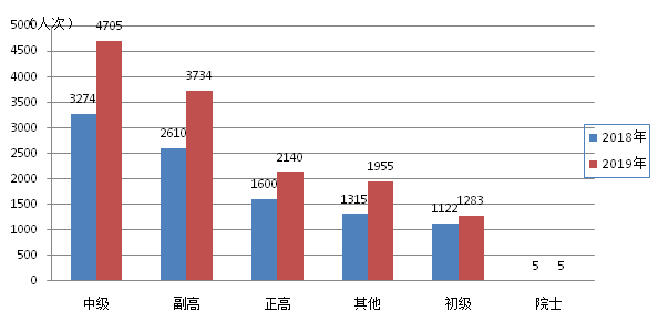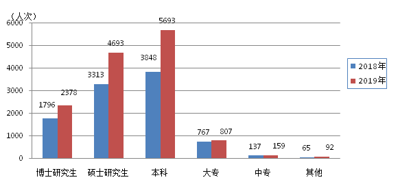 從完成人員文化程度分布來看,本科學歷5693人次,占總?cè)藬?shù)的41.2%;碩士研究生4693人次,占34.0%;博士研究生2378人次,占17.2%;大專807人次,占5.8%;中專及其他共計251人次,占1.8%。從增幅來看,各學歷人員均有不同程度的增長,其中本科、碩士研究生和博士研究生增幅顯著,分別較上年增長47.9%、41.7%和32.4%。