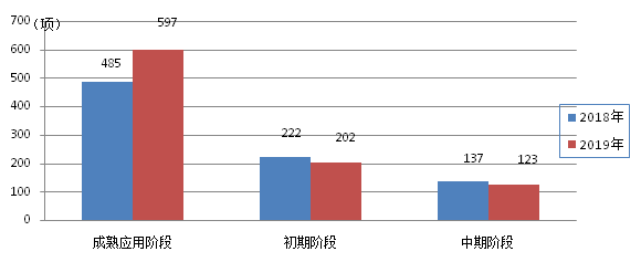 圖7 2018-2019年應用技術(shù)成果所處階段對比圖