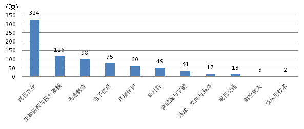 統(tǒng)計數(shù)據(jù)顯示,在922項應用技術(shù)成果中,有791項屬于高新技術(shù)領(lǐng)域,占到應用技術(shù)成果八成以上。我省科技成果共涉及11大類高新技術(shù)領(lǐng)域,其中現(xiàn)代農(nóng)業(yè)、生物醫(yī)藥與醫(yī)療器械、先進制造、電子信息、環(huán)境保護與新材料六大領(lǐng)域的成果占到了全部高新技術(shù)領(lǐng)域的九成以上,特別是現(xiàn)代農(nóng)業(yè)領(lǐng)域達324項,占41.0%。