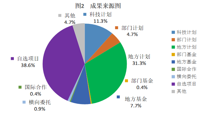 在233項登記的科技成果中,屬于政府項目成果(來源于國家計劃、地方計劃、部門計劃、地方基金和部門基金的成果)占55.4%,比2018年降低11個百分點,其中國家科技計劃26項、占11.3%,地方計劃73項、占31.3%,部門計劃11項、占4.7%,地方基金18項、占7.7% ,部門基金1項、占0.4%;社會項目成果(來源于國際合作、橫向委托、民間基金、自選課題及其他來源的成果)占44.6%,比2018年提高了11個百分點,其中自選課題產(chǎn)生的科技成果較上年提高了10.7個百分點,增長較快。(見圖2)