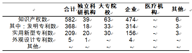 全年登記的科技成果中共產(chǎn)生582項知識產(chǎn)權(quán),較上年度增長28.8%。其中577項為發(fā)明專利和實用新型專利,占99.1%,外觀設(shè)計專利占0.9%(見表3)。