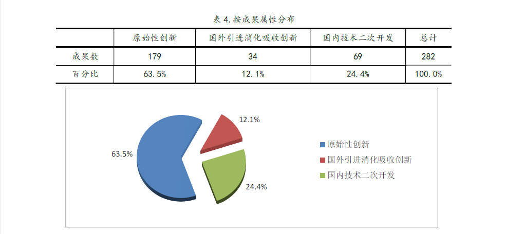 在282項(xiàng)應(yīng)用技術(shù)成果中,“原始性創(chuàng)新”成果占成果總數(shù)的63.5%,“國(guó)外引進(jìn)消化吸收創(chuàng)新”成果占12.1%,“國(guó)內(nèi)二次開發(fā)”占24.4%(見表4)。