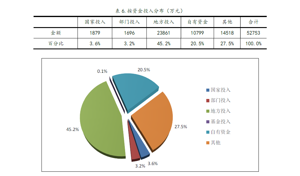 2019年度登記成果的經(jīng)費(fèi)實(shí)際投入額總計(jì)52753萬元。其中,國(guó)家投入1879萬元,占3.6%;部門投入1696萬元,占3.2%;地方投入23861萬元,占45.2%;自有資金10799萬元,占20.5%;其他投入14518萬元,占27.5 %(見表6)。