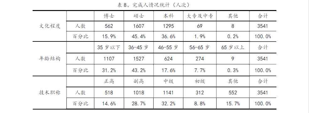 登記成果共涉及完成人3541人,按文化程度、年齡結(jié)構(gòu)和技術(shù)職稱分布情況(見表8)。