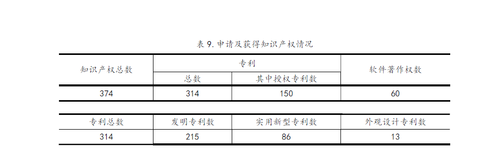 在282 項(xiàng)應(yīng)用技術(shù)類成果中,申請(qǐng)知識(shí)產(chǎn)權(quán)及獲得知識(shí)產(chǎn)權(quán)數(shù)量共374 項(xiàng),其中,專利314 項(xiàng),軟件著作權(quán)60 項(xiàng)。在314項(xiàng)專利中,授權(quán)專利150 項(xiàng)(見表9)。