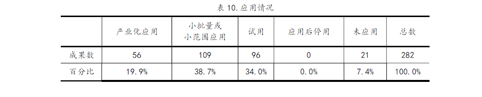在282項(xiàng)應(yīng)用技術(shù)成果中,“國(guó)際領(lǐng)先”占3.5%,“國(guó)際先進(jìn)”占17.0%,“國(guó)內(nèi)領(lǐng)先”占40.8%,“國(guó)內(nèi)先進(jìn)”占20.2%,“國(guó)內(nèi)一般”占1.8%,“未評(píng)價(jià)”占16.7%(見表5)。